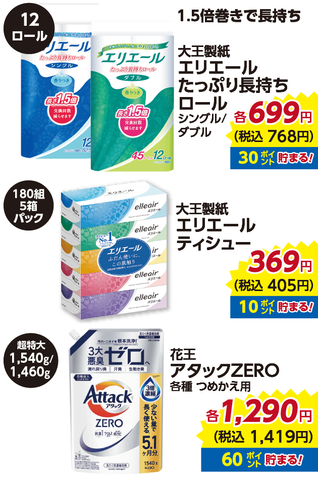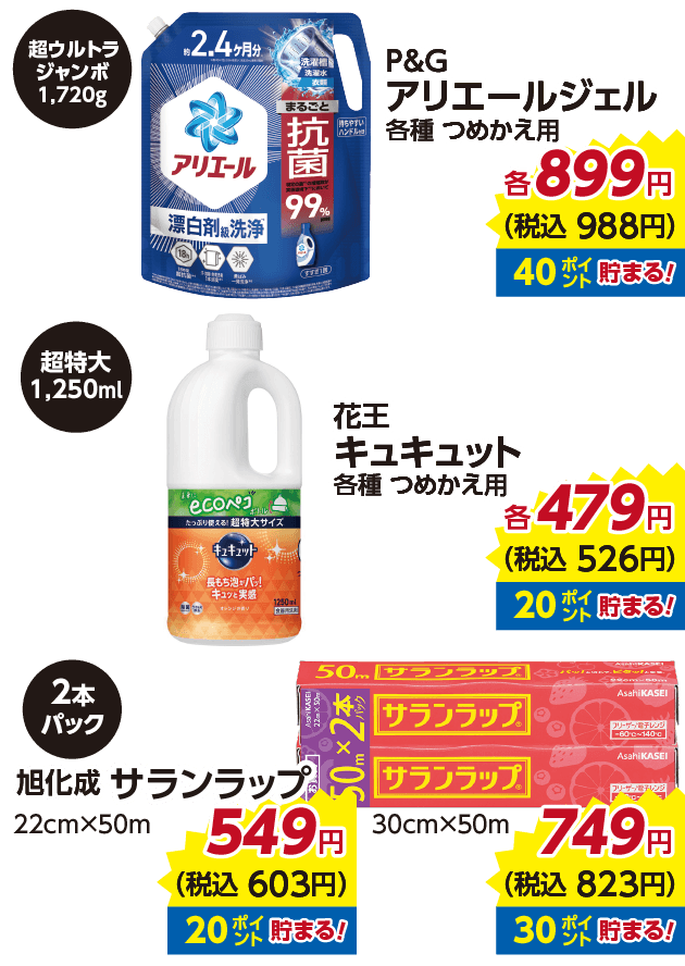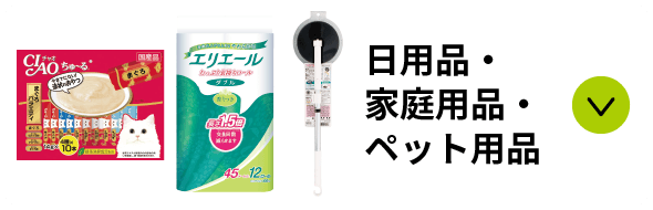 ●日用品:化粧品、化粧小物、シャンプー・リンス、石鹸、歯磨き、歯ブラシ、髭剃り、食器用洗剤、衣料用洗剤、住居用洗剤、トイレットペーパー、ティッシュペーパー、生理用品、消臭・芳香剤、台所消耗品、調理ラップ、アルミホイル、使い捨て食器等