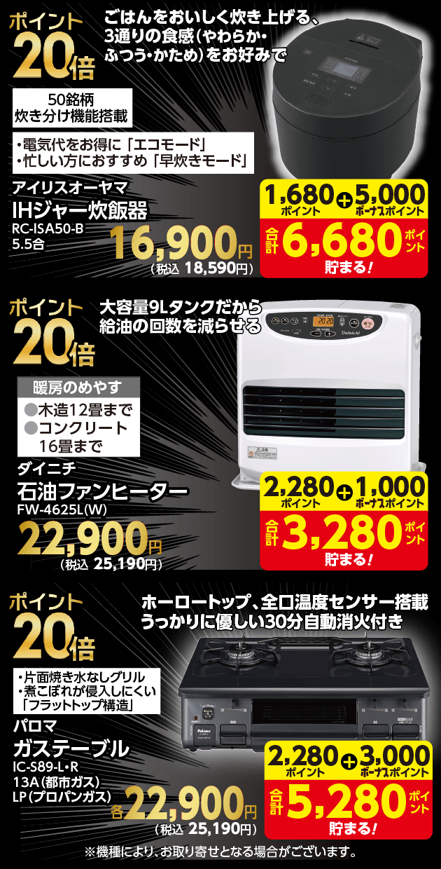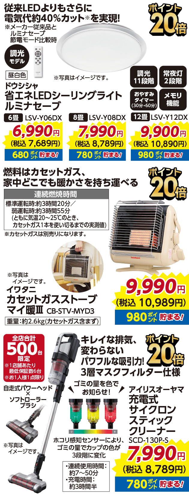●家電商品:調理家電、ガス家電、家事家電、理美容家電、av機器、季節家電、電池、照明器具、電球・蛍光灯