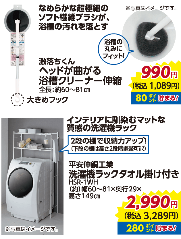 ●家庭用品:掃除道具、洗濯小物・物干用品、風呂フタ・イス・桶、洗面小物、バス・トイレ・キッチン用マット、調理道具、食器・卓上小物、台所小物