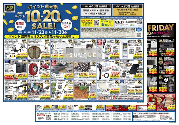 【予告】11月22日(土)より開催!ポイント還元祭のお買い得商品ロイヤルホームセンターでは、2025年11月22日(土)より、「ポイント還元祭」を開催いたします!基本ポイントが10倍または20倍になる、大変お得なセールです。公式オンラインストア「ロイモール」でも同時開催!この機会にぜひご来店いただきお買い求めください。お買い得商品の詳細は、各店舗のチラシをご確認ください。▼各店舗のチラシはこちらから▼※店舗によりお取り扱い商品が異なります※以下に記載が無い店舗はチラシ対象外です【栃木県・茨城県】小山 ・ 牛久【千葉県】野田 ・ 柏 ・ 南増尾松戸 ・ 白井 ・ 習志野千葉北 ・ 千葉 ・ 千葉みなと【埼玉県・東京都】戸田公園 ・ 足立鹿浜 ・ 南千住【神奈川県】梶ヶ谷 ・ 相模原橋本横浜四季の森 ・ 伊勢原・ 戸塚深谷港南台 ・ 藤沢 ・ 湘南大磯【愛知県】長久手 ・ 日進香久山 ・ 新守山西枇杷島・ 津島【京都府・奈良県】物集女 ・ 押熊 ・ 奈良【大阪府】枚方 ・ 吹田 ・ 豊中 森ノ宮 ・ 堺 ・ 河内長野【兵庫県】キセラ川西 ・ 宝塚 ・ 西宮塚口 ・ 西宮中央 ・ 三田北神戸 ・ 東灘魚崎 ・ 加古川【岡山県・広島県】築港 ・ 矢賀トップページへもどる