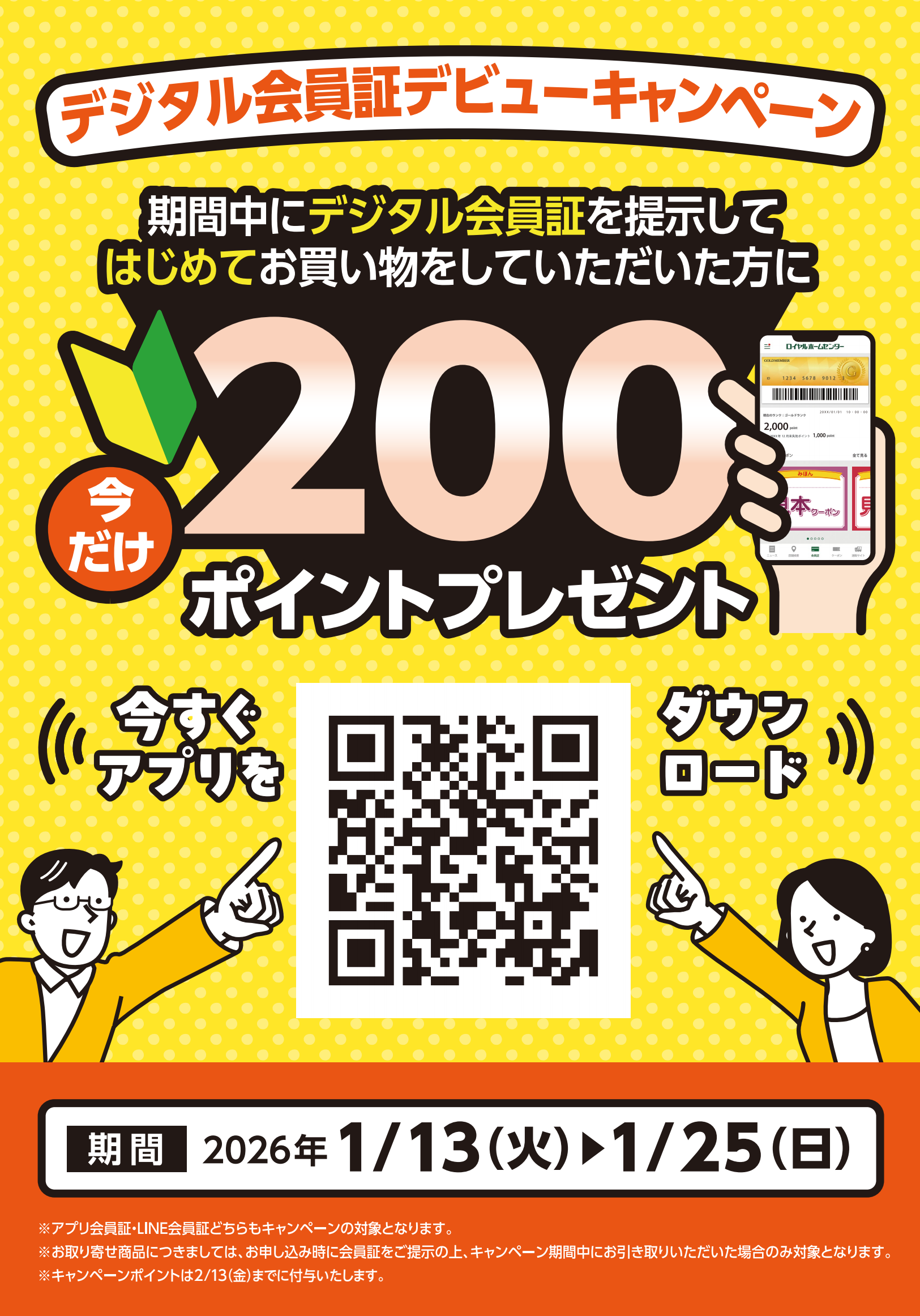 【1月25日(日)まで!】デジタル会員対象 デビューキャンペーン キャンペーンご注意事項 ●アプリ会員証・LINE会員証どちらもキャンペーンの対象となります。 「デジタル会員」とは、アプリ、LINEミニアプリ、ロイモールのいずれかから会員登録を行い、2801から始まる会員番号をお持ちのお客様です。 ●お取り寄せ商品につきましては、お申し込み時に会員証をご提示のうえ、キャンペーン期間中にお引き取りいただいた場合のみ対象となります。 ●キャンペーンポイントは2月13日(金)までに付与いたします。 ▼アプリ会員証のダウンロードはこちらから▼※App Storeは、Apple Inc.の商標です。※Google PlayロゴはGoogle LLCの商標です。トップページへもどる