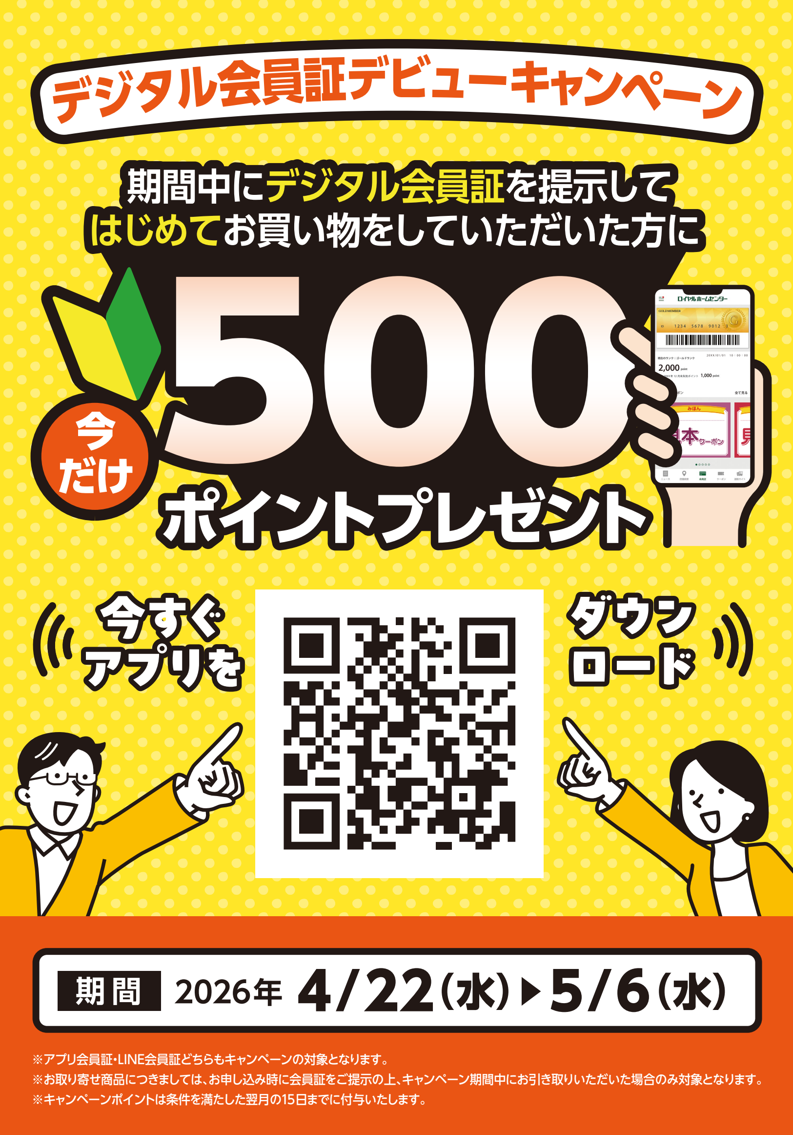 【5月6日(水)まで!】デジタル会員対象 デビューキャンペーン キャンペーンご注意事項 ●アプリ会員証・LINE会員証どちらもキャンペーンの対象となります。 「デジタル会員」とは、アプリ、LINEミニアプリ、ロイモールのいずれかから会員登録を行い、2801から始まる会員番号をお持ちのお客様です。 ●お取り寄せ商品につきましては、お申し込み時に会員証をご提示のうえ、キャンペーン期間中にお引き取りいただいた場合のみ対象となります。 ●キャンペーンポイントは条件を満たした翌月の15日までに付与いたします。 ▼アプリ会員証のダウンロードはこちらから▼※App Storeは、Apple Inc.の商標です。※Google PlayロゴはGoogle LLCの商標です。トップページへもどる