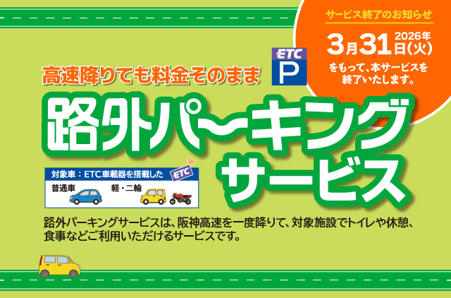 豊中店 路外パーキングサービスのご案内豊中店 路外パーキングサービス終了について 阪神高速道路株式会社が実施している「路外パーキングサービス」社会実験は2026年3月31日(火)に終了いたします。※阪神高速ホームページはこちら詳細は阪神高速ホームページでご確認いただけます。トップページへもどる
