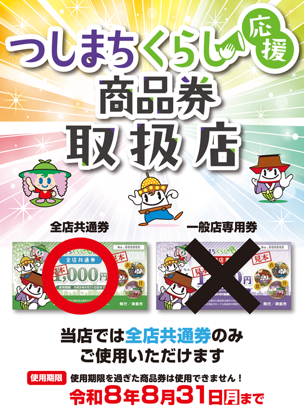 ※津島店では「全店共通券」と記載された商品券のみご使用いただけます。